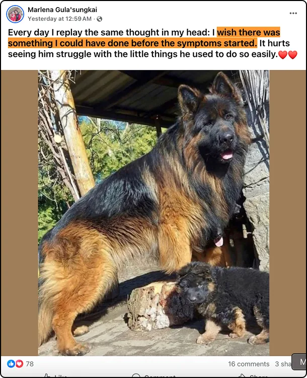 "I lost my first German Shepherd to DM at age 10. When I got Duke, I swore I'd do everything differently. He's 8 now, still running like a puppy. I'll never know if he would've gotten DM, but I'm not stopping these chews to find out."