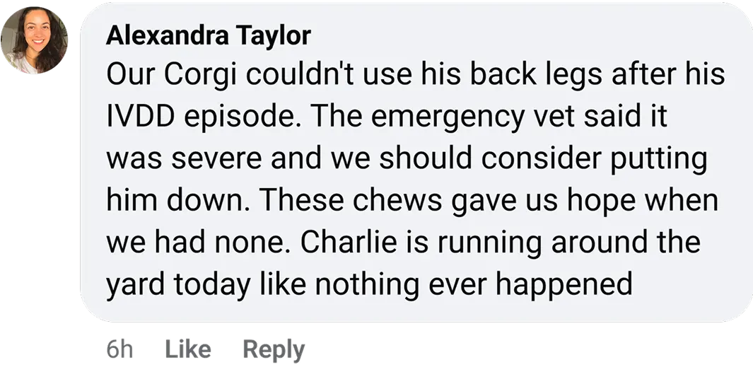 Update from my comment last month: 3 months in and Diego (my Corgi) hasn't had a single back pain episode. He used to whimper when getting up from his bed. Now he bounces up like nothing. These chews literally gave me my dog back. 🙏