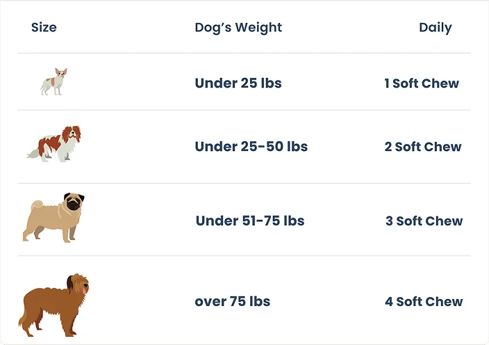 Dosing is simple and based on your dog's weight: Mini dogs (under 25 lbs) get 1 chew daily, small dogs (26-50 lbs) get 2 chews daily, medium dogs (51-75 lbs) get 3 chews daily, and large dogs (over 75 lbs) get 4 chews daily. Just give with their regular meal - easy!