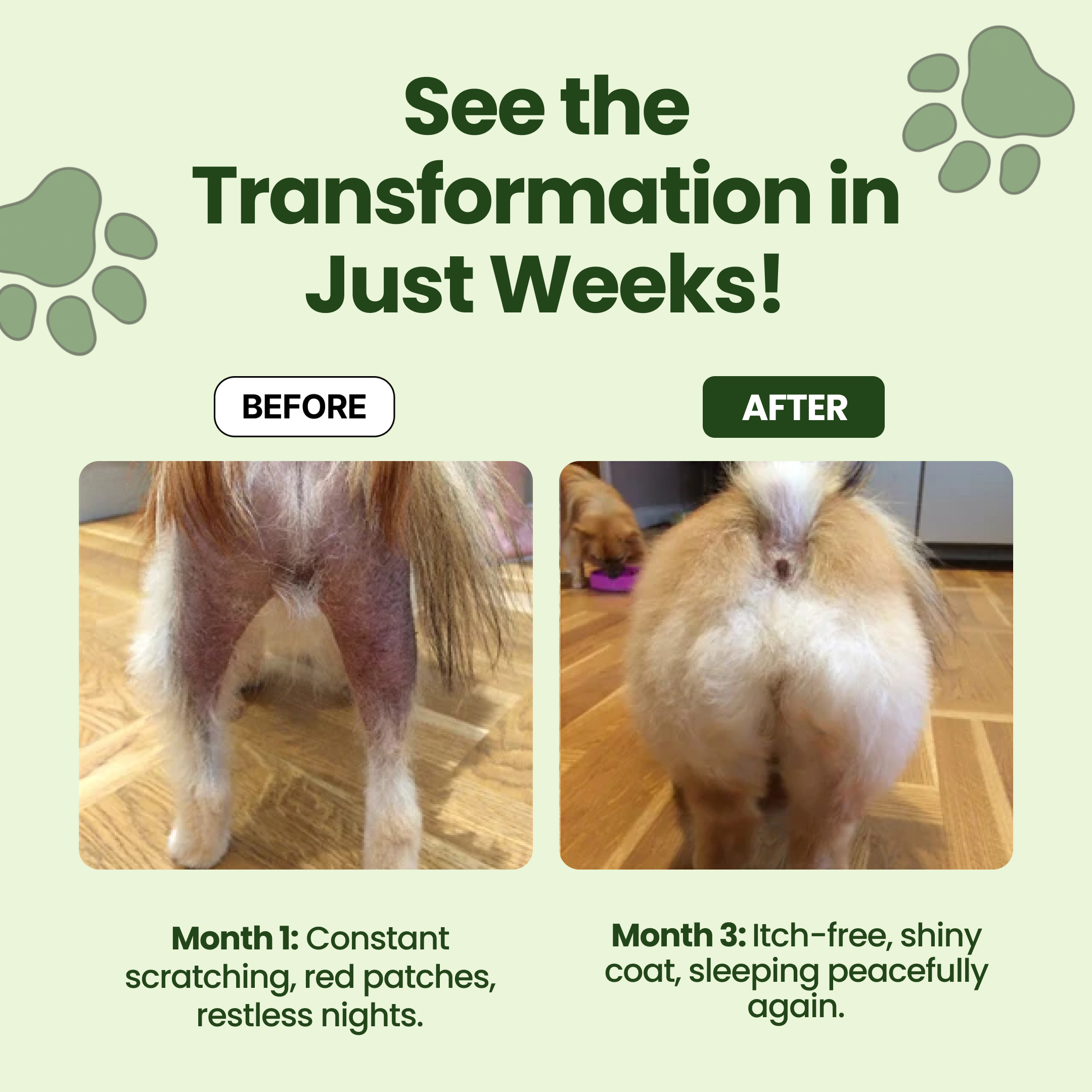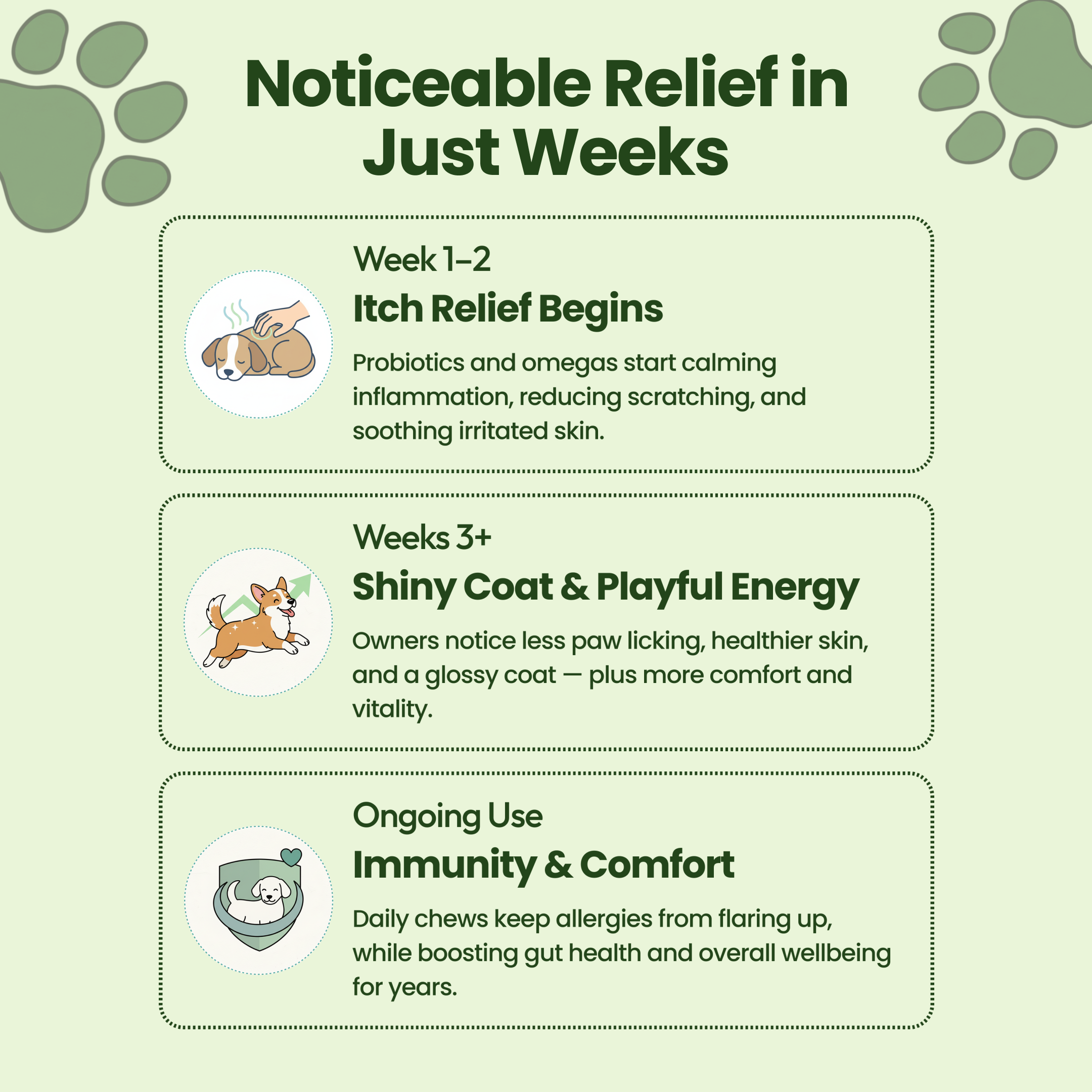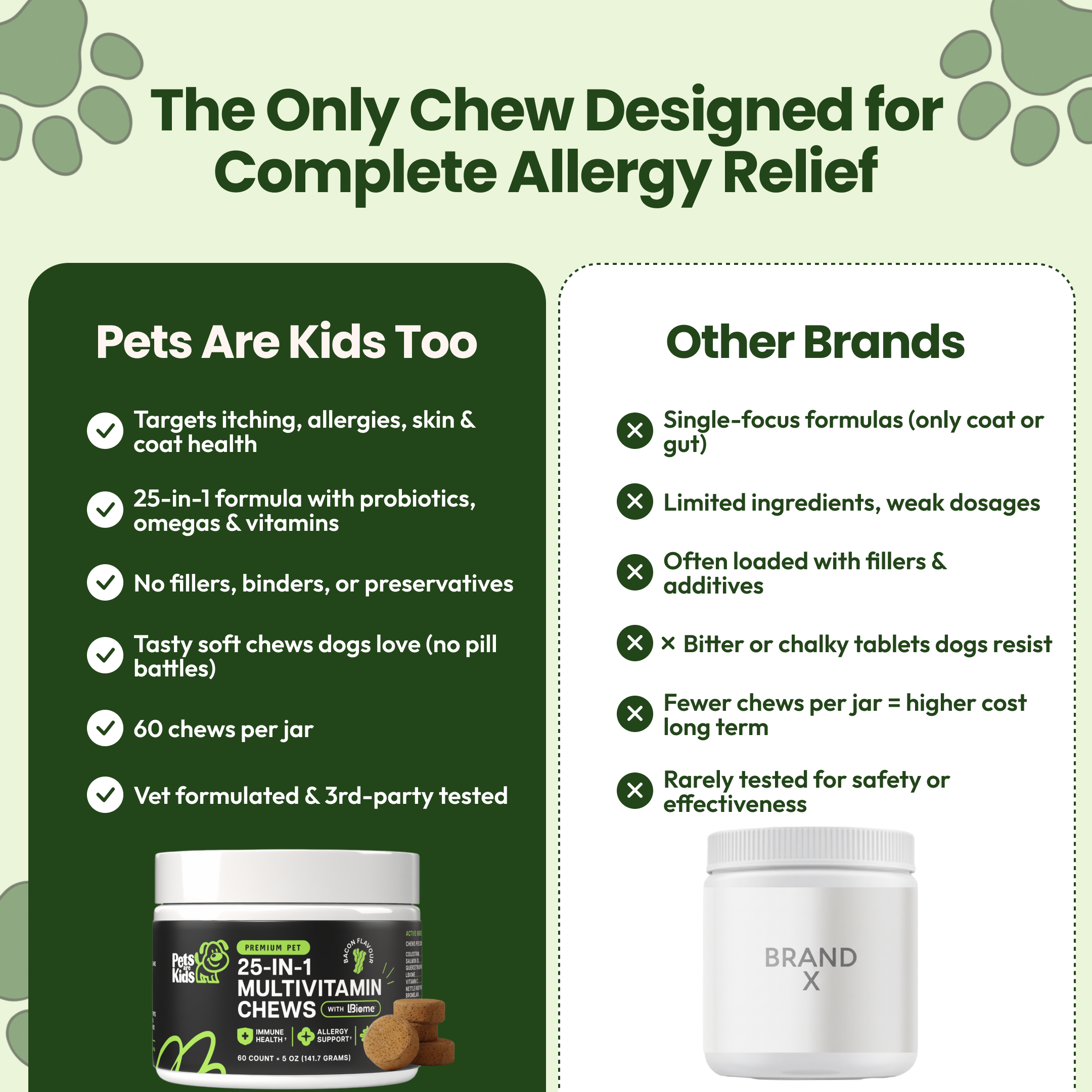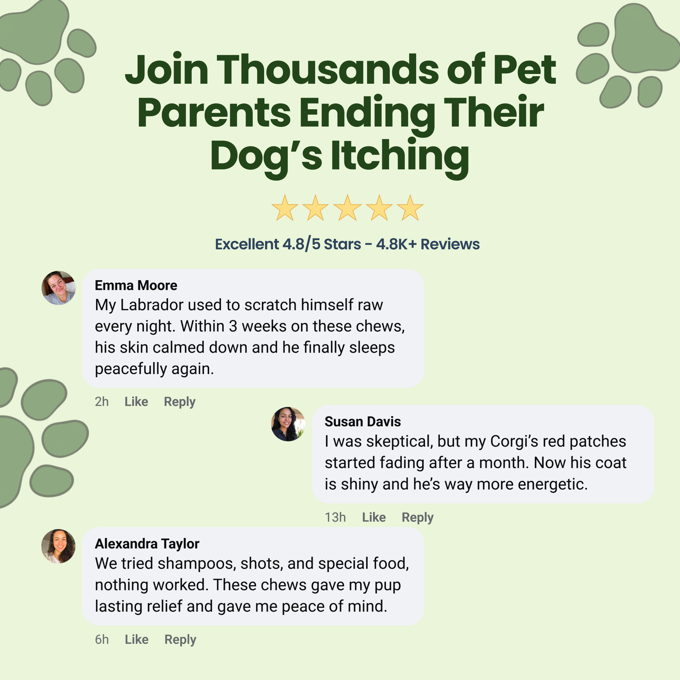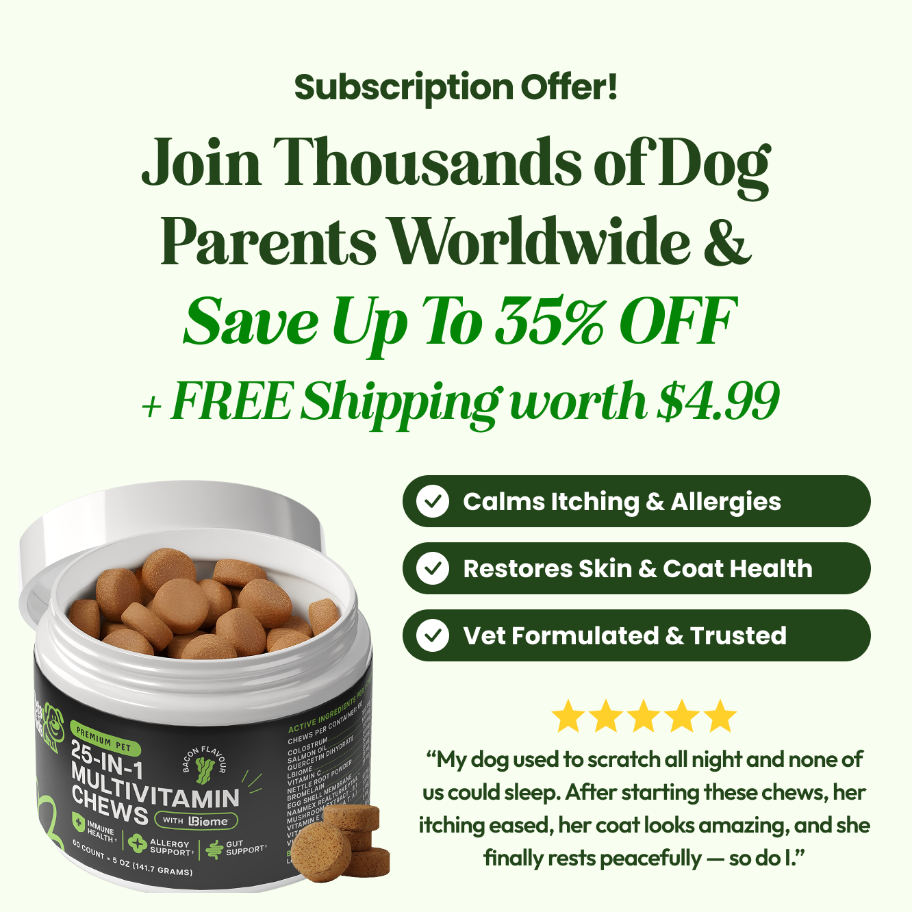 The itching and scratching you're seeing aren't just annoying – they're signs your dog's immune system is overreacting. Our vet-formulated multi-vitamin chews target the root cause, naturally reducing inflammation and histamine response while supporting overall health.