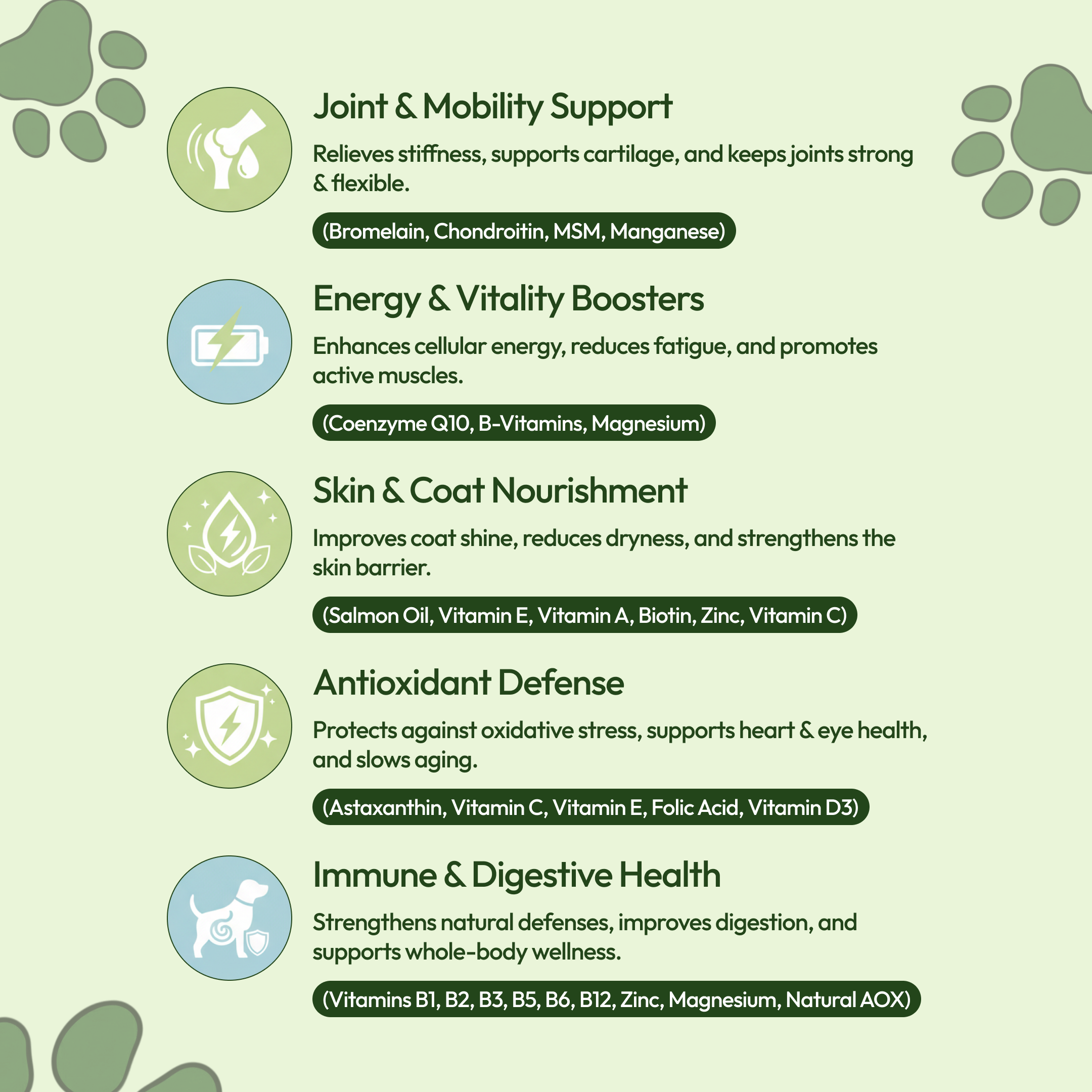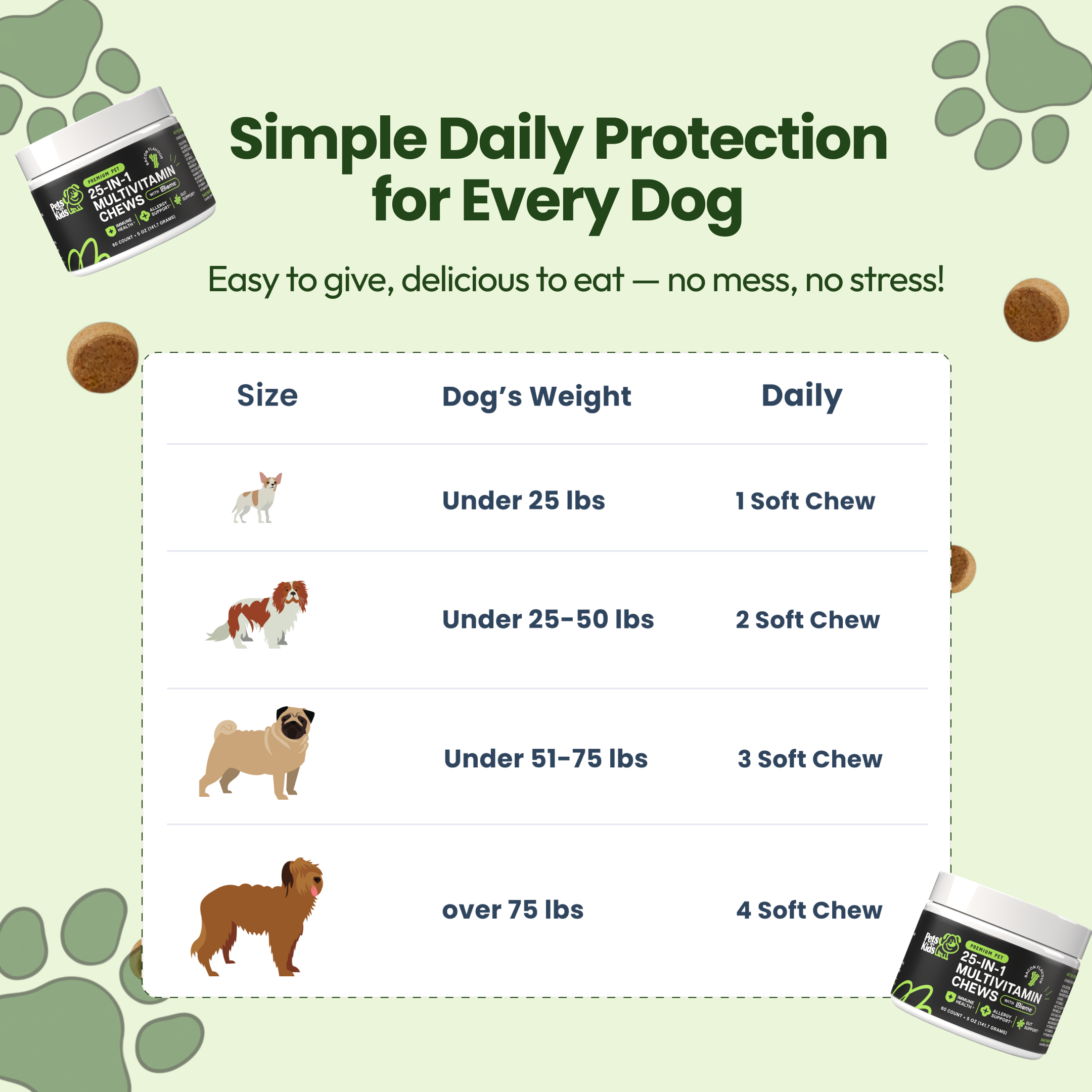 Our Premium 25-in-1 Multivitamin chews are packed with 25 amazing multivitamins picked by experts to keep your dog’s immune system strong, protect their cells, and fight early aging. With daily use, you might see your dog looking and feeling more lively and energetic in just a 3 weeks*.